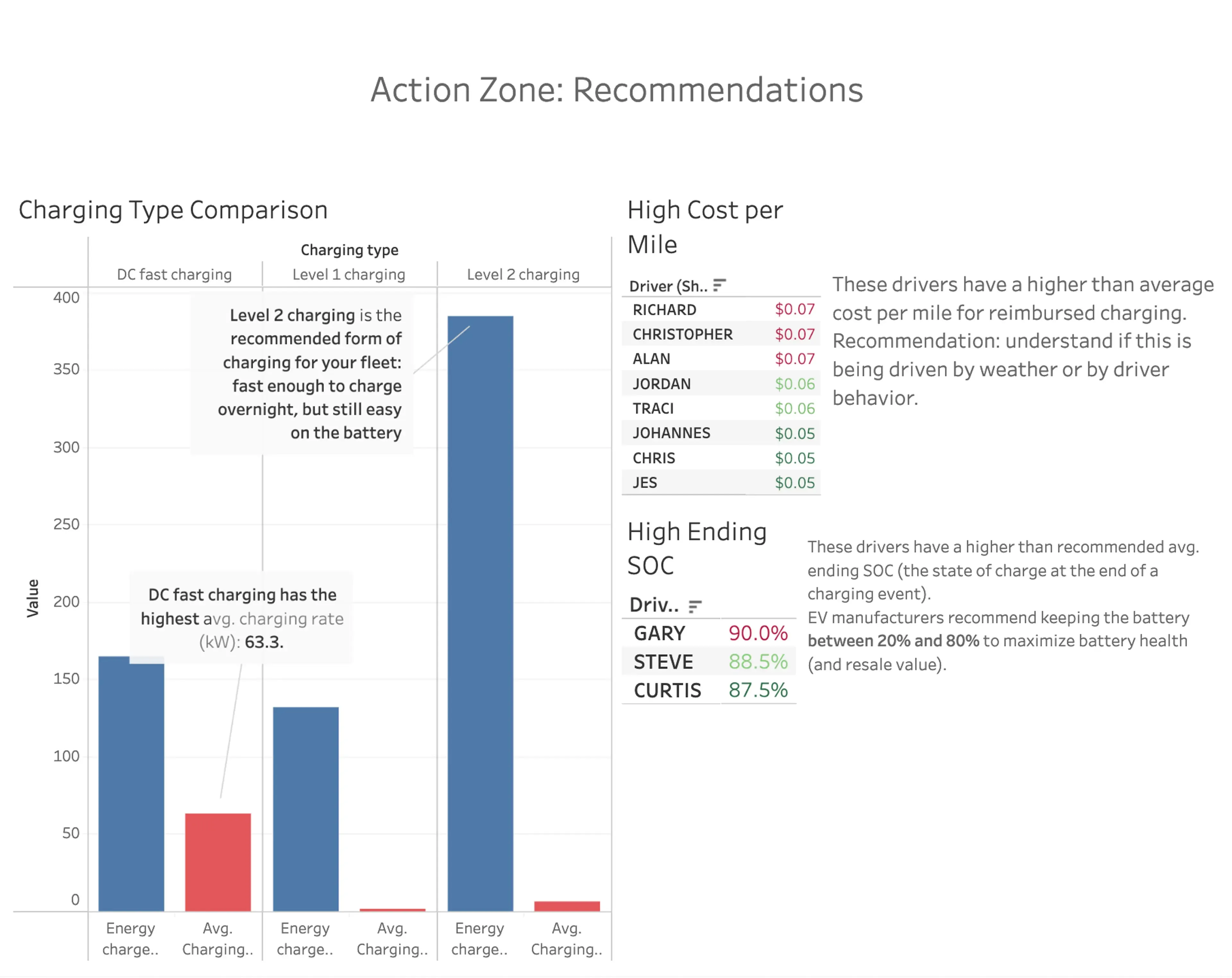 Below is an example of how EV charging data informs driver-level decisions. By comparing cost per mile, charging type, and end-of-charge SOC, fleet teams can quickly identify reliance on fast or public charging, higher-than-average reimbursement costs, and charging behavior outside company guidelines. These insights helped this customer guide charging behavior and scale a consistent home charging program across the fleet.